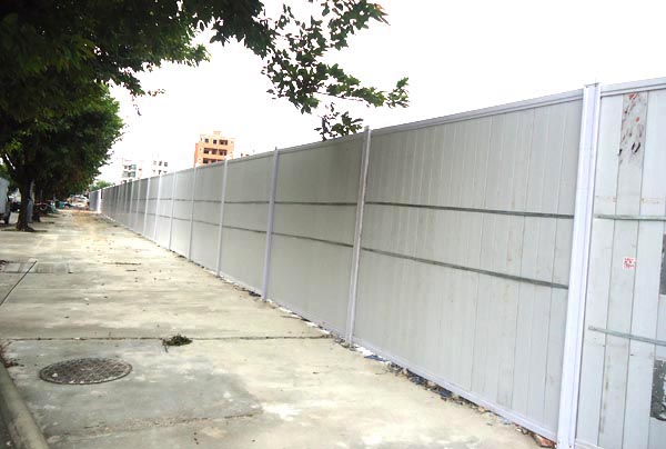 施工圍擋用白色彩鋼板作墻體,用藍(lán)色雙拼C型鋼作立柱,立柱頂部配藍(lán)色造型端蓋(可裝路燈),圍墻四周用藍(lán)色彩鋼框邊。高矮、大小、色澤一致。臟污后隨時(shí)可用水清洗擦拭。